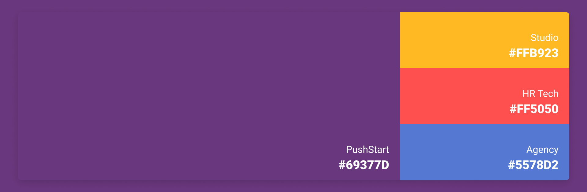 A cor que representa a PushStart é o Roxo. Cada vertente da empresa, incorpora sua cor na identidade. São elas; Estúdio (Amarelo), RH Tech (Vermelho) e Agência (Azul). Os valores de cada cor são respeitados a fim de criar a uniformidade da marca.